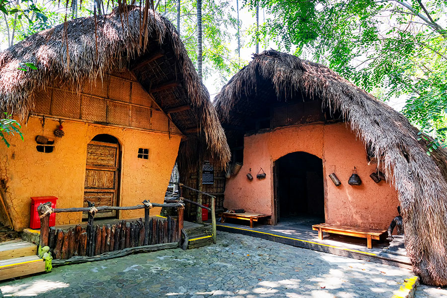 Constructed around the original Li and Miao village, the now large-scale, popular tourist destination offers visitors a window into every aspect of the local people's traditions, from the boat-shaped houses they live in, to the history of making fire by rubbing sticks, to the way they make quilts and clothes from tree bark. Visitors may indulge in nature of enchanting beauty, appreciating folk customs, ethnic melody, enjoying ethnic foods, Li and Miao styled lodging and cultural art.