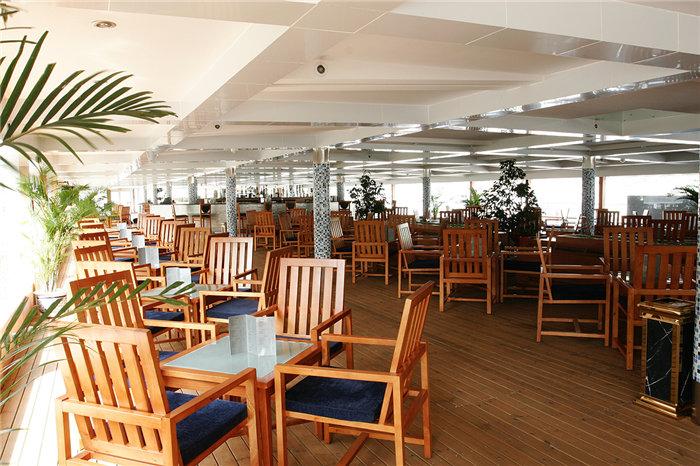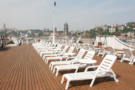 The Century Sun, which took its first voyage in 2010, is one of the newest ships on the Yangtze River. Features The ship boasts the largest cabins, which all have river-viewing balconies. Other facilities include an administration deck, a VIP restaurant, a cigar bar, a five-deck tall hollow lobby, and two elevators. The ship serves both Chinese and Western cuisine. Breakfast and lunch are buffet style, and dinner is a table banquet setting. The ship is perfectly equipped with a sauna room and massage parlor, KTV, a theatre, a gym, a conference room, and a business center, providing great conveniences to passengers. The ship boasts two diamond suites, 14 executive cabins, four deluxe suite, and 112 deluxe standard cabins. The two diamond suites are the largest among all of the Yangtze cruise ships and provide room occupants with a river-viewing balcony.