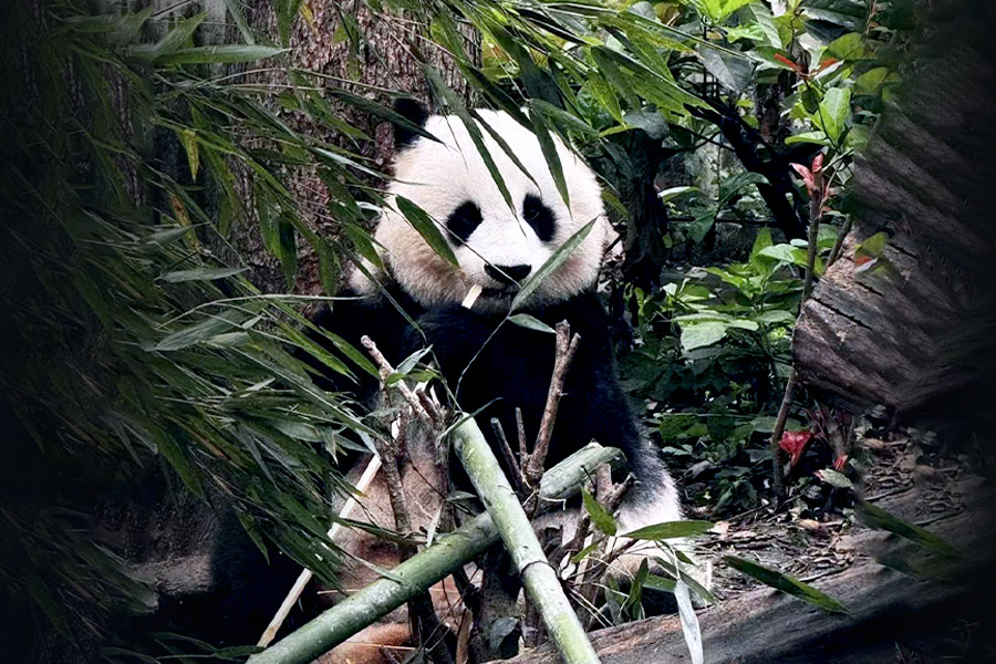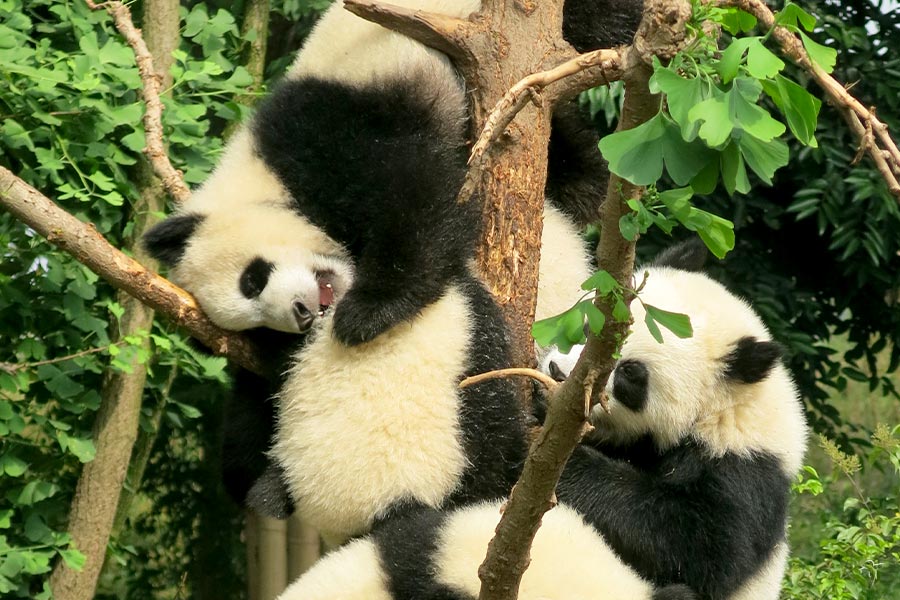 Then we will visit the Chengdu Panda Breeding Research Base, which was built to imitate the wild ecological environment of pandas. It covers a space of 92 acres, with a green coverage of 96 percent. The base created a perfect ecological environment for the living and breeding of pandas and other precious and rare wild animals. It breeds over 20 pandas and lesser pandas, black-necked cranes, white cranes and others.
