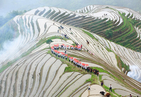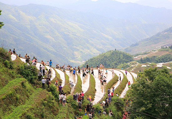 Combing Rice Seedling Festival is one among these colorful activities. As a traditional folk festival in Longji (Dragon’s Backbone) Rice Terraces scenic area, it is held around the Grain in Ear (one of the 24 solar terms) every year. This year it falls on June 6. When thunder and rain sweep the paddy fields in Longsheng, local peasants pick up an auspicious day and led by the village head, sacrifice and pray with bamboo torches at the side of fields.