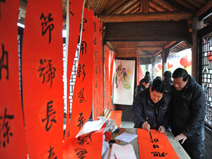 Sticking Spring Festival Couplets on the main door of home is a necessary program in spring festival. The Spring Festival Couplets compose two vertical scrolls on both side of the door and one horizontal scroll on the top of the door. In the ancient time, people thought the peach wood can ward off the ghost, so the peach wood boards in the spring festival were erected in front of the door with religion drawings on the wood boards. This is the origin of Spring Festival Couplets. In the Han dynasty paper was invented. Because red color is lucky color in China, the red paper gradually replaced the peach wood and beautiful poem replaced the religion drawings. The content of the rhymed poems on the couplet express good wishes of the owner of house, like more money, good health, long life and peaceful life etc People favor the couplets written in good calligraphy style. Good Spring Festival Couplets are perfect combination of good wishes, calligraphy and poems.