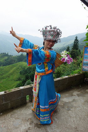 We are now up in the Yao Mountain, or Yaoshan. We've been told that for the minorities in the mountain region, it is important for the young woman of 16 years of age to be part of an arranged marriage. We've also been told that it is a desirable quality for this young woman to have a 'big ass' for more of an ease in a child delivery. The wife in these mountain minorities often deliver their own baby. As our driver approaches a turn they hit the horn in order to let any oncoming traffic know that here I am. One can procure a drivers license at the age of 18. We have arrived at the Long Ji Terraced Fields Scenic Area. It's time for a bathroom break. We enter the area and continue our mountainous assent. We have just finished a performance by the Yao minority women in the village of. These women have long shiny black hair and is often thought of in China as some of the most beautiful hair in the world. Their dance performance is all about their beautiful hair. Hair is the essence of life for these women. These women put on an entire very colorful dance program for the many in attendance and it's all about their hair.