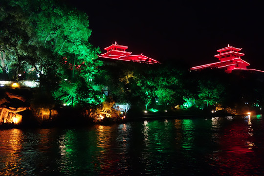 We continued our walk to a lake where an evening boat ride was in store for us on a pretty fancy boat. What a boat ride it was. What an experience it was. The two rivers and four lakes included Li river, peach blossom river, Rong lake, San lake, Gui lake and Mulong lake, they are connected and linked-up each other. actually, it's a waterway transportation which made up of Guilin downtown round the city water system. So hence the name. There has fomed a complete moat river system in Guilin since over 1,000 years ago. The lakes were colorfully lit up as were the bridges. Dancers were at various places in enclosed by glass. Colorful entertainment on the shores. Words are lacking to describe this magnificent boating experience. The night boat cruise passed the two river and four lakes. Many different kinds of beautiful lights are all opened and makes the two river and four lake looks more wonderful and colorful. There are some music fountains and folk song show you can see on the way.