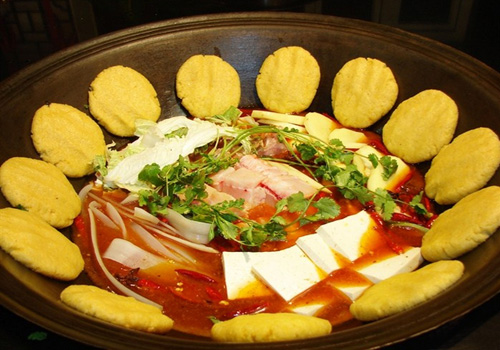 Fish and tofu stewed in iron pot & corn cakes in Northest China