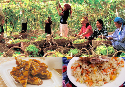 Turpan, extreme drought, the hottest region in China, boasts China’s sweetest grapes. Sufficient sunshine and active photosynthesis assist grapes to accumulate sugar. Ripe grapes are hanged in airing room to be dehydrated by time. When raisins done, it is the time to make hand pilaf for celebration. Xinjiang special yellow carrot, mutton, tomato and raisin can create a rich flavored hand pilaf. Hotan, offers sweeter grapes than Turpan, uses grape juice to make a high-calorie dessert, Xinjiang Nut Cake. Boil grape juice on the fire of 115 degree centigrade, when juice concentrate to syrup, mix in baked walnut kernel.
