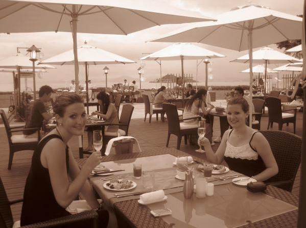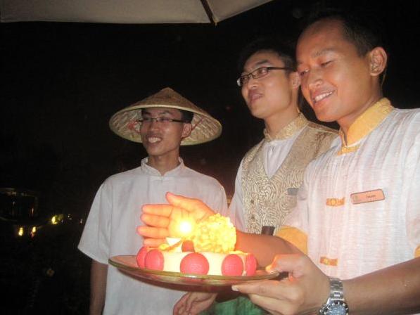 At 6pm Alina surprised me with my moved up birthday present: we took part at the special barbecue of the Banyan Tree Hotel which takes place each Saturday night for the guests. The tables were arranged with sea view and a seafood- and meat-BBQ had been build up which were framed by different kinds of western and Chinese appetizers (Noodle salad, Olives, Tomato – Mozzarella Salad and so on), bread, noodles and rice and lots of different desserts. For pre-celebrating my birthday we also ordered a bottle of sparkling wine and from then on started to get food from the buffet. The whole atmosphere was relaxed and solemn while we watched the sunset in the sea. Also the rain which started to pour down at about 8.30pm was not disturbing as we were sitting under umbrellas. Suddenly three of the servants came with a cheesecake and candles on it and sang “Happy Birthday” to me!