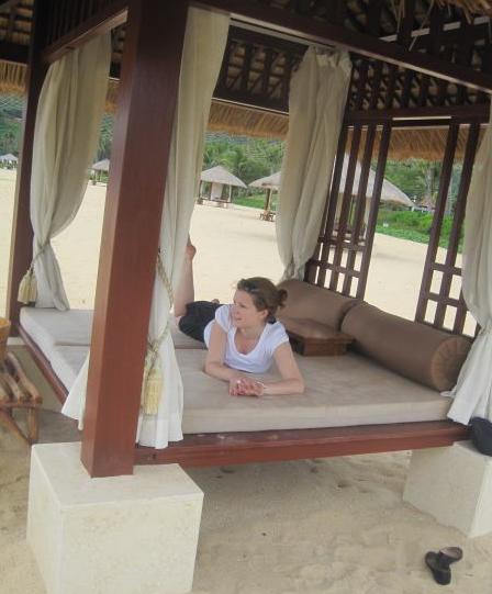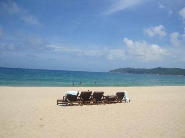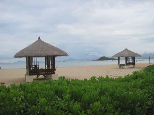 The first thing which was stunning to me was that everywhere around Chinese couples wearing matching Hawaiian Shirts and Shorts. I could not have imagined this picture before and I have to admit that it looks extremely funny. We walked along the beach, passing tens of see food restaurants facing the sea. It was the first time I saw Chinese women wearing Bikinis and moving freely like that at the beach. We simply sat down, enjoyed our ices and the atmosphere at the beach. Afterwards we went downtown to have dinner at a Muslim barbecue place at the street (Heping Jie). We had a specialty of Hainan: broiled dried squid, broiled eggplant and other food. As a dessert we got Qing Bu Liang, made out of coconut milk and a mixture of lots of different fruits, like pineapple, melon, red beans and so on. Then we had a walk across the night market and through a shopping mall before taking the bus into the direction of Dadonghai. We got off the bus at “Jiulu”, where lots of (mostly Russian) Clubs and Bars are located and went to “Rainbow Bar & Grill”, a western restaurant located at the harbor. There we had a Campari with Orange Juice, one of our favorite Cocktails in Germany but hard to get in China. It was a nice place, which was only tarnished by the live band and the mosquitoes. The next day we took the bus No 15 to Yalong Bay, the most beautiful beaches of the island, where we wanted to spend a day at the Ritz Carlton. After having entered the hotel we went to the beach and took a small cabana to relax and go swimming. The weather was beautiful and we had to take care not to get sunburned.