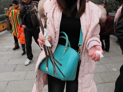 ( People pick up branches or firewood in the hope of keeping on making money in the new year.)