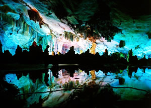 Our first destination on day one was the Reed Flute Cave Scenic Spot, which is the most renowned cave with fantastic scenery in Guilin. On the way to it, we were deeply attracted by the nice limestone Karst mountains and beautiful countryside sights. We could even smell the flavor of fruit from the local farmer's orchards. Undoubtedly, it's a relaxing experience for those who always work in the office far away from the nature. After arriving there, we could not wait to explore this 240-metre-deep cave with a total tour course of around 500 meters! We entered it and passed through the sinuous steps. So what appeared in front of us? It's a huge natural art palace with delicate treasures! We were greatly surprised by the different-shaped Karst stalactites, stalagmites, sheets and flowers lit up by colorful lights; and it is interesting that each of them has its own name such as Diamond Hill (Zuan Shi Shan), Flying Waterfall on the Gorge (Gao Xia Fei Pu), Primeval Forest(Yuan Shi Sen Lin). All of them are so amazing that you would never spare your compliment on it.