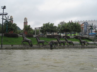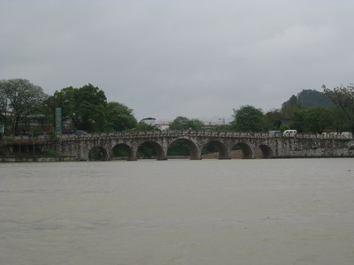 The new cruise route includes Li River and Four Lakes, we started the cruise from the pier at Elephant Trunk Hill, although it rained a little, it made the air more fresh and the scenery more clear and beautiful. People say the Guilin scenery is more attractive and charming in misty and rainy day, so, we were lucky to enjoy such fairy landscape. The boat turned around the Elephant Trunk Hill and let the travelers have chance to enjoy it with panorama. Then boat continued to sail along Li River, the cruise was leisure and tranquil, you can see the Seven Star Park far away and Fubo Hill closely. When the boat arrived Diecai Shan (Folding Brocade Hill), we disembarked there, you can have chance to climb up to the top of hill, but we just went through into the park. This park is just located in the Wooden Dragon Lake (Mulong Hu), from here, we were on the Four Lakes cruise. On the cruise, you can pass lots of different styles of bridges with its own story. No wonder, people say Guilin is like the Venice in China. After sailing in about 45minutes, we arrived the last stop in Chinese Fir Lake (Shan Hu). Here is the best shot point for the Sun Tower and the Moon Tower.
