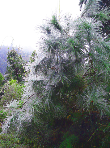 After a short breakfast in the morning of the next day, we went to the Baoding Waterfall scenic spot through about 30 minutes of trip along the hilly road. During the road, we saw the beautiful ice scenery which can be seldom seen in Guilin city. There are many pine trees along the road covered with ices, white and green mixed together, composing a beautiful picture. Some of the pine trees blend to the road, seeming like a door of the icy palace. Therefore, the ice scenery became the main attraction we enjoyed during the visit to the Baoding Waterfall scenic spot. The ice hangs in different plants and comprised various charming landscapes, amazing! The Baoding Waterfall and terraced fields around it were also attracting and we wanted to visit it again next time.