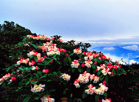 Ermei Mountain, you must enter a colorful flower world: crystal ice flowers, bright red azaleas, golden rape flowers and pink peach blossoms…the ice flowers form on the golden top of the mountain, like your dream flying in the sky; the azaleas and winter jasmine are brilliant and beautiful, covering the whole mountain. Peach blossoms and rape flowers make the country beautiful as painting.