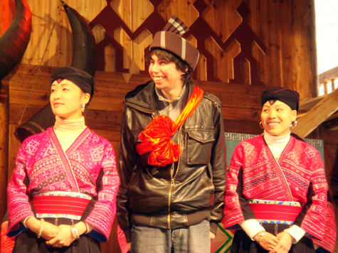 It was the first time we went there. We got off from Guilin railway station at 8:40 in the morning and arrived in the performance area two hours after first, named "Huangluo Performance Area". The performance costs about 80 yuan per person and was hosted in both English and Chinese. There are many actors in red clothes of Hong Yao Minority (a branch of Yao) and we took photos with them first. Although it was in the off season, the area was full of people.
