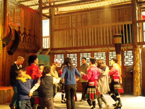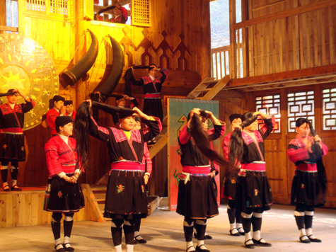 The whole performance lasted for about 50 minutes and the interactive performance with the audiences are the highlights. Some gentlemen would be invited to be the bridegroom to perform with the bride-actresses. And you can always hear laughs during their play. I was impressed by the hair custom of females of Hong Yao. They keep the custom to wear long hairs from twelve or thirteen years. They do not cut hair causally and always collect the cut hairs carefully. Becoming mother, the females can wear their cut hairs. In Huangluo Yao Village, there are more than 60 long-hair females. And you can tell whether a female of Yao people is married and have baby or not. During the performance, the audience could taste local Oil Tea, Glutinous Rice Cake and wine.