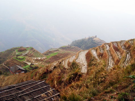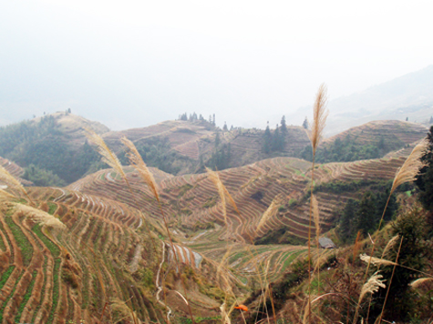 (Plus: terrace is a common scenery formed in the mountain areas of south China which is made up of fields and crops. While large-scale terraces like Longji Terraces is hardly seen. Longji Terraces is praised as the crown of world terraces, which covers about 66 square kilometers on the hills with altitudes ranging from 300 meters to 1100 meters. The sceneries of Longji Terraced Fields change with seasons because of the changing color of crops. It can be different block paintings in spring, summer, autumn and winter: green, golden or white and black. )