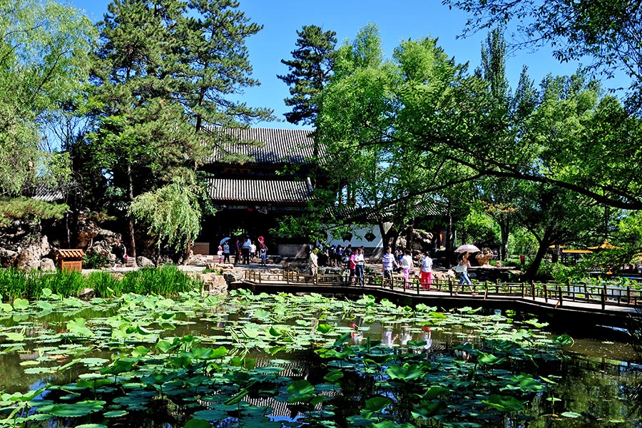 Besides, 11 magnificent temples stand on the hills in a semi-circle in the outlying area, among which 11 temples are under the administration of Beijing government, thus be called Eight Outlying Temples. These temples, built on the elevating hill slopes, looking grand and splendid. The wood engraved Buddha with 42 arms in the Puning Temple, 22.28 meters tall, is the largest of its kind in the world. Pu’ning Temple is a famous temple combing Han and Zang ethnic group styles, with a golden 22.28 meter tall Avalokitesvara. There are also other classical temples: Xumifushou Temple was a imitation of the residence of Panchan-Lama-Zhashilunbu Temple; and Putuozongsheng Temple is in the similar shape of the Potala Palace.