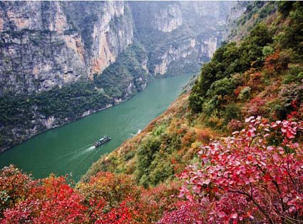 Emerald Gorge extends for 20 km from the Double-Dragon Town to Tujiaba. It is the longest and also gathers the beauty of the Lesser Three Gorges. On the banks, each peak seems more beautiful than the other does and the bamboo groves are luxuriantly verdant. No waterfall in not swift; no water is not green. Mandarin ducks swim in pairs in the river and monkeys leap from branch to branch. Other scenic spots include the Water Curtain Cave , Stalactitic Buddha on Cliff, the Dancing Rain from Heavenly Spring, Sheep Cliff, the Mini-Three Gorges on Madu River , Imitation Plank Paths, Steel Rope Bridge , Sky-Scraping Red Wall, Boat Coffin, Two Eagles Playing on Screen and Flying Clouds Cave .