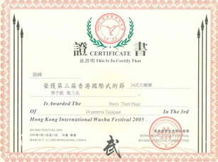2007 Awarded the first place of both Gu Chuan Taijiquan and 24 Patterns Taijiquan in the 5th Hong Kong Wushu International Festival