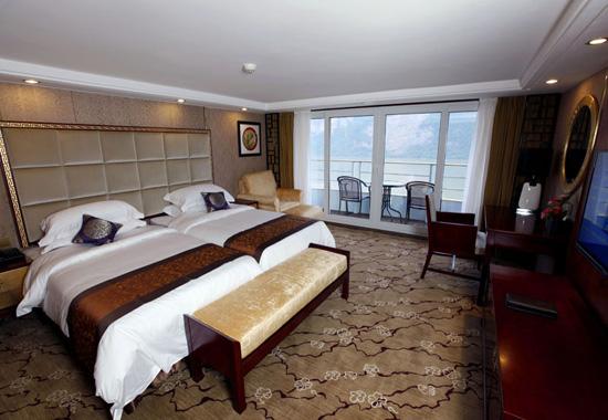 Yangtze Gold Cruises is the newest and best cruise line sailing the Yangtze River. Featuring the most luxurious and technologically advanced river cruises in the world. Marvelously built with 21st century standards and technology. The ships have viewing decks over 40 thousand square feet, ocean wave simulating swimming pool, cigar bar, panoramic river viewing bar, fitness room, spa (both western and Chinese), and large cabins each with its own private balconies for viewing and tranquility.