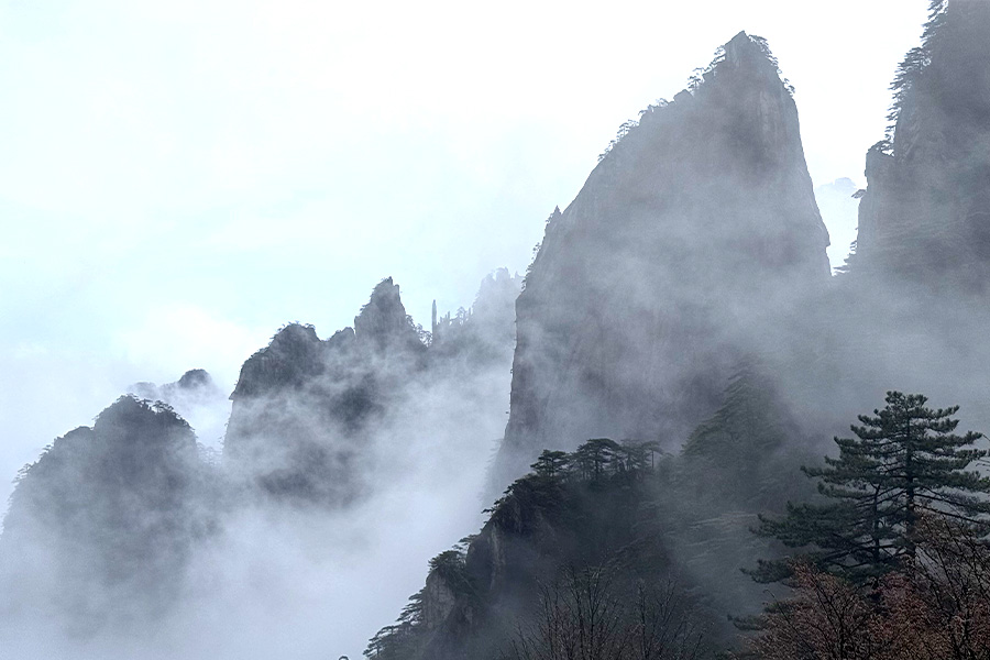 Mt. Huangshan, known as "the loveliest mountain in China", is famous for its magnificent scenery made up of many granite peaks and rocks emerging out of clouds. Its landscape features “four wonders” of imposing peaks, spectacular rocks, odd-shaped pines, and a sea of clouds. Mount Huangshan boasts 72 peaks, more than 1,000 meters above sea level, with three main peaks rising majestically. The famous Welcoming Guests Pine (1,500 years old) and See-Guest-Off Pine have become a symbol of being faithful, unyielding and hospitable.
