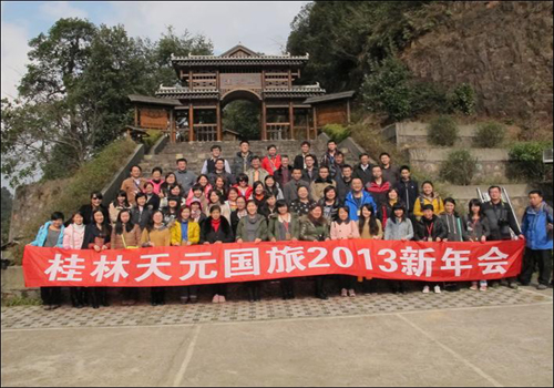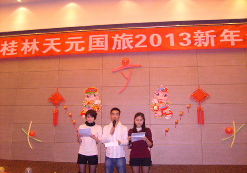The 2013 annual meeting party of Guilin Tianyuan International Travel Service Co., LTD. was held in banquet hall of Guxiang Holiday Village of Hot Spring. All of the staffs were present and seated awaiting eagerly the celebration. When the bell of six o’clock in the afternoon struck, the party began. Before the dinner, Manager Mr. Yang gave a speech to express his gratitude for the hardworking of the staff. Next Manager Mr. Cao proposed a toast to the prosperity of the company. Then sumptuous meals were just before us; to a large degree, it was really a feast to the eyes! Lusty singing by Japanese Department, voguish dancing Tianyuan Style by Outbound Travel Department, heart-stirring lucky draw, and fascinating games were staged alternatively. What performance did we VisitOurChina give? It was solo plus mixed chorus! Each of us first sang a nostalgic song like “More Than I Can Say”, "God Is a Girl”, "My Heart Will Go On”, "Sailing”, "The Day You Went Away” and “Edelweiss”, before all the members of the team ending up our performance with the famed “Take Me Home, Country Roads”. During the party, peals of laughter and hearty rounds of applause lingered in our ears. The carnival lasted for around three hours and each of us got at least one souvenir.