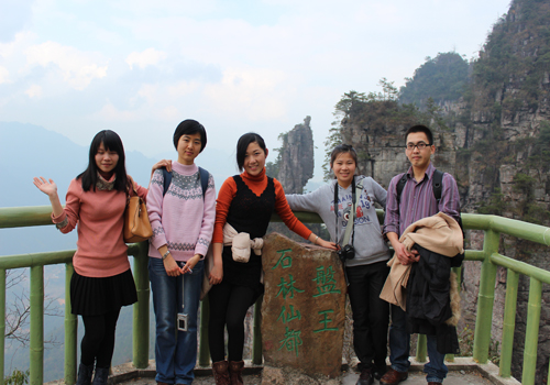 Half-an-hour drive led us to the foot of the mountain and when all colleagues were present, we got about climbing. It was really a gripping tour! The heaven-kissing stone forests, exuberant virgin forests, age-old trees, and Rhododendron simiarum Hance var. versicolor (Chun et Fang ) Fang f. all composed a mirage and graceful picture spreading before our eyes, which gave a delightful dimension to our hard and steep way of hiking. As it was getting late, we hastened our paces and at half past five in the afternoon, we eventually returned to the gate of the mountain. Fatigued as we felt, we were beyond ourselves in that we not only conquered the precipitous mountains but challenged ourselves.