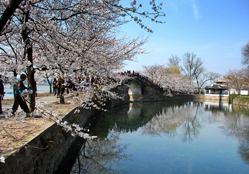 If you are in Yuantouzhu, the best place to appreciate cherry blossoms is on the Changchun Bridge. The quiet environment, classical pavilions, and arch bridge throw the flowering cherries into elegant beauty. Shutterbugs in Turtle Head Isle can take marvelous pictures with sakura as foreground and the seven-masted boat as background, which cannot be snapped in any other places.