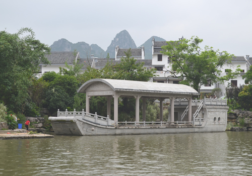 Followed by Lujia Village, which is quite a tranquil and appealing place. People say that once a man with family name Wu in the village had five sons, so the place had been called Wujia Village, due to Wu and Lu to some extent are homophonic, thus came the name Lujia Village. Near the entrance to the village, there is a boat-like structure made of cement at the River bank, before being asked if it is a pavilion for enjoying cool air, "it is the stage for local people performing Guangxi Opera sometimes" the tour guide said, full of pride.