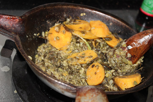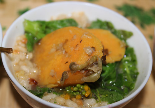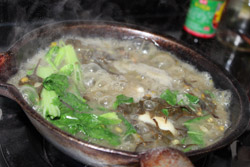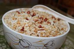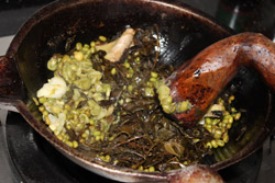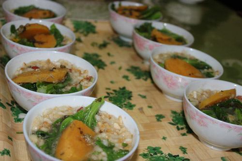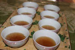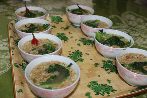 Cooking steps: Firstly, you need to fry the rice, and then cook the first cup of sugar tea with a specialized pot: boil the water with tea-leaves and white sugar. Sugar tea is used to stimulate your appetite. It is extremely impolite if you don’t serve your guests with sugar tea in Guanyang County. Secondly, prepare the main ingredients tea-leaves, fried rices, noodles or rice noodles, and cook the mung been, fresh melons, cauliflowers, and potato chips in the pot as condiments. Lastly, you boil the water with oil, salt as the tea... OK, now we finished all the preparations! Get your bowl and enjoy the delicious Guanyang Oil-tea: add the condiments into your bowl and then pour into the boiled tea you made in last step - It is golden yellow and incredibly delicious!