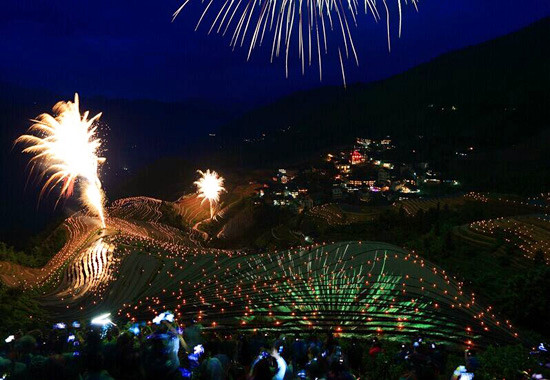 Activities: When night falls, according to local customs, girl will carry a torch to the fields of her betrothed husband’ family to help with transplanting work, in return her sweetheart will give her a carved seedling comb. Torches are lit gradually in the village, and people carry the flaming torches walking on the field ridges to form a beautiful brocade. Fireworks are set off over the terraced fields, how spectacular the scene is!