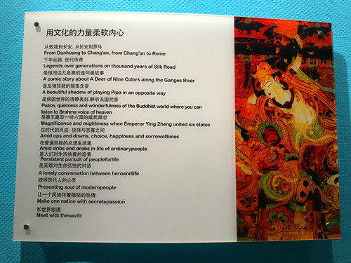 There are three exhibition parts in Dunhuang Museum. At the entrance of first part, there is a huge painting on the wall, it is the copy from Yulin Caves, the original paintings are not frescoes but instead executed on an earthen render with mineral and organic pigments and gum or glue binders.
