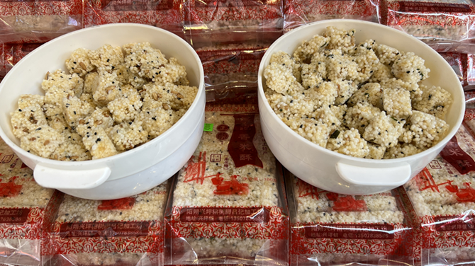 We can find a lot of local snacks on the street. On the balcony, people are stretching out pieces of sweet potato to dry in the sun. And we must try the famous snacks ' song hua tang ' and ' mi hua tang ' which are made of preserved egg and rice, it’s very crispy with sweet or salty flavor.