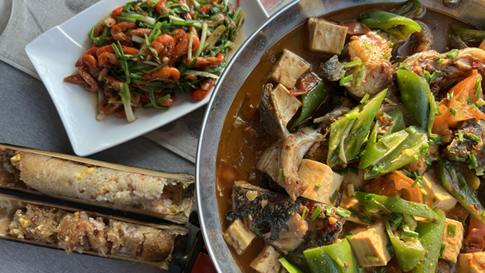 After exploring several hotels, we went back to Xing Ping town to enjoy the local cuisine 'beer fish'.