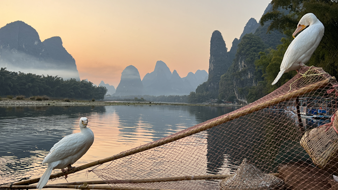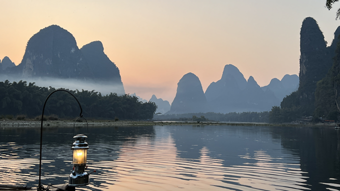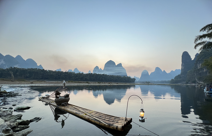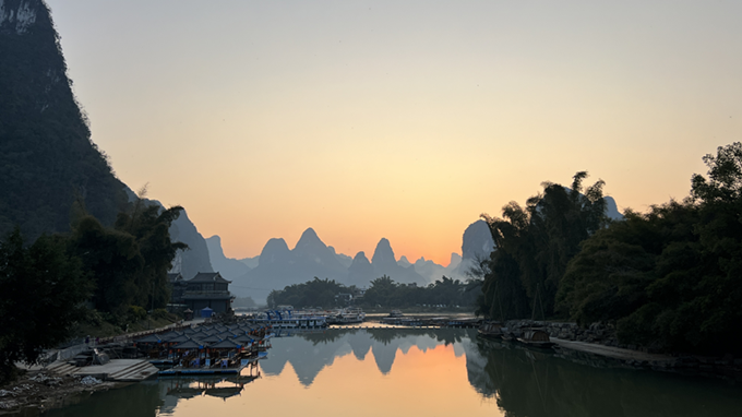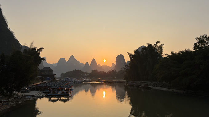 Walking past the wharf and across an iron bridge, we arrived at the 'Xiao Bei Cun' where we can get the best view of sunset on Li River. That's the best view on the heaven and it’s the background of Renminbi 20 Yuan. Enjoying the beautiful view!