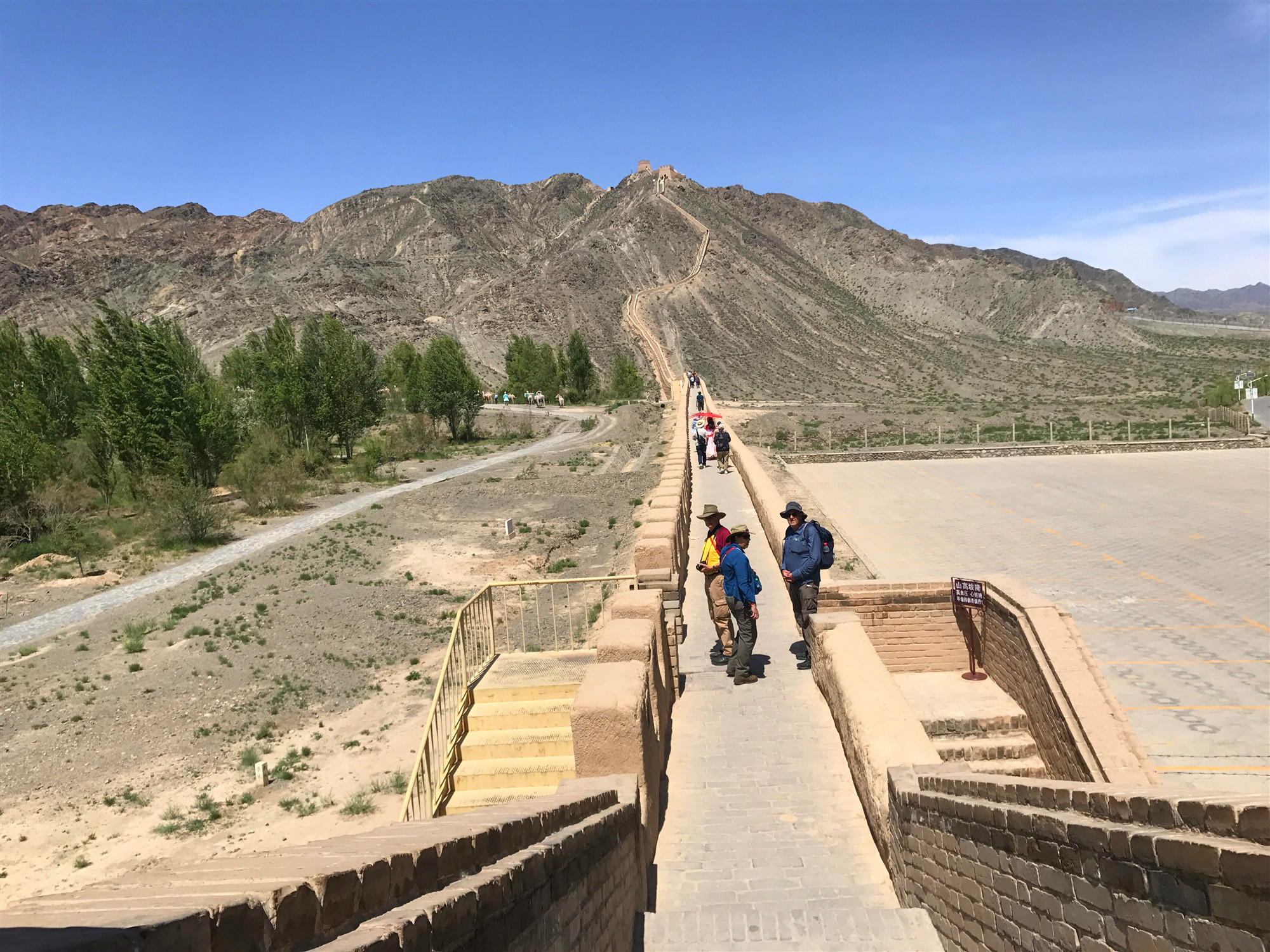 Then continued to visit another section Great Wall, called Overhanging Great Wall, it only takes about 10 minutes from Jiayuguan Great Wall to there. The Overhanging Great Wall is an important part of the defense network of Jiayuguan. It was built in Ming Dynasty (1368-1644) to strengthen the defensive capability of the Jiayuguan area. Before we climb up the long wall, it looks like a dragon overhanging the slope of Black Mountain. If you like hiking, you can try to climb the whole section, it takes about 1 hours up and down.