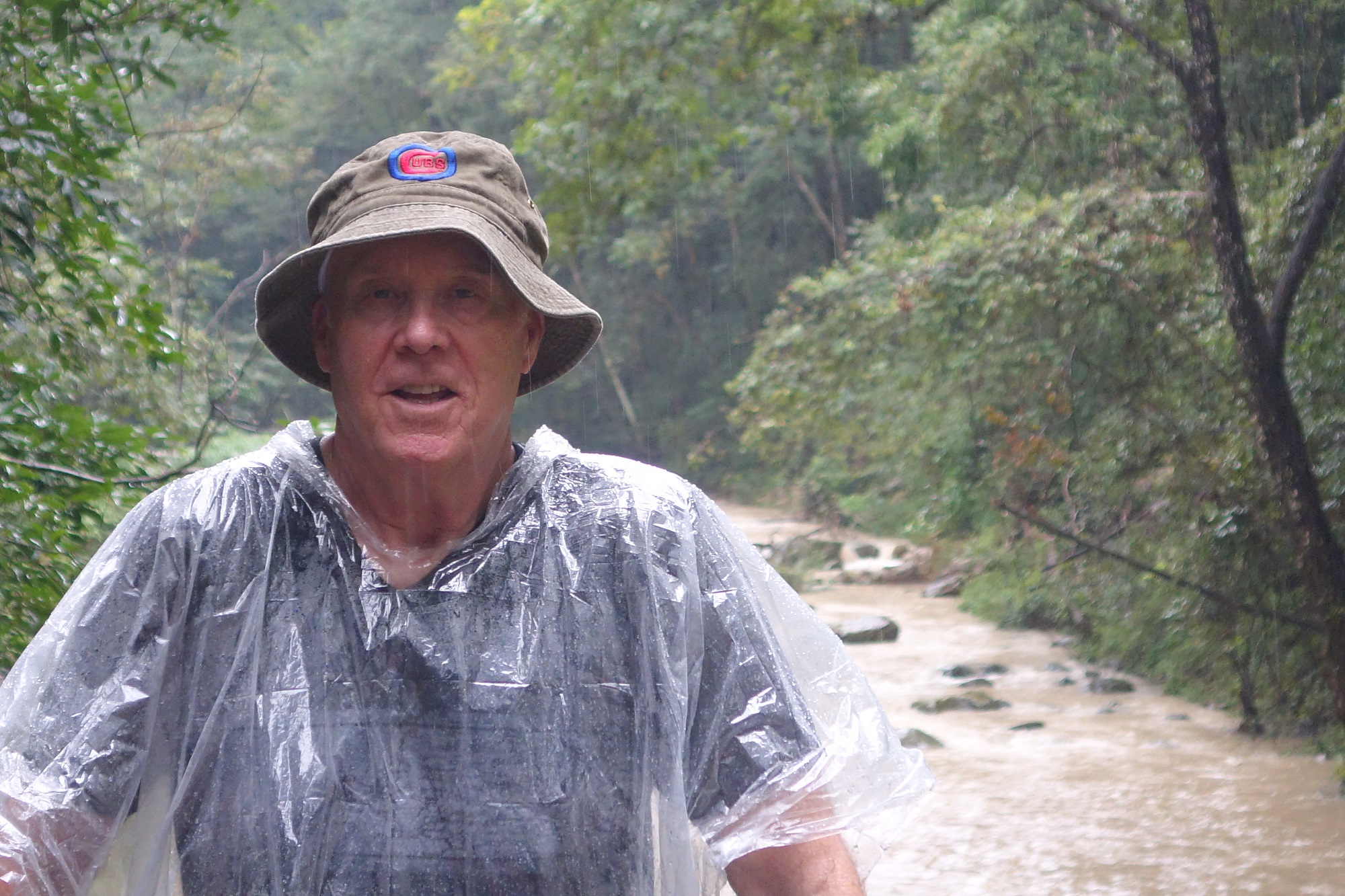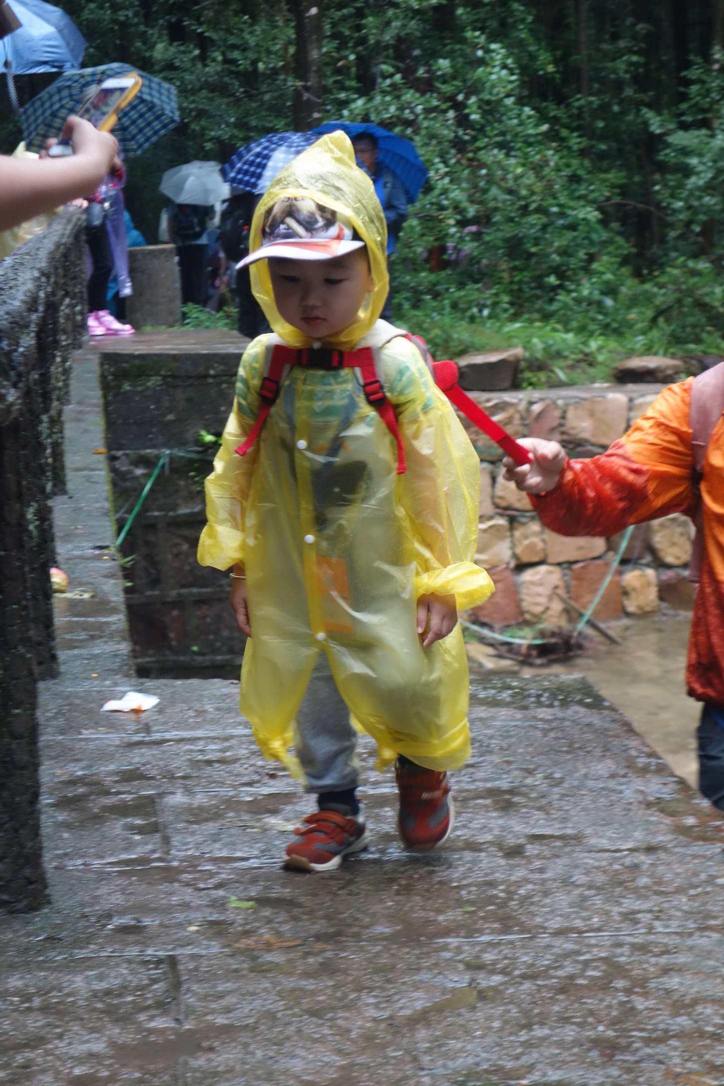 The rain continues. Melody met us at our hotel at 9 AM and off we went adorned in our rain gear. We got about 6 blocks from our hotel when I discovered that I didn't have the 'train card' that I needed so back to the hotel for me. Following that delay I finally caught up with Melody and Jay. In the meantime Jay decided the risk of getting his very expensive wet and damaging it was too great, Jay decided not to travel up to the mountain with us this morning so back to the hotel he went. Melody got in the long queue for the shuttle bus. Lot of people, many shuttle buses. We finally got on a bus and went up the mountain to the Golden Whip Stream area. The original plan was to walk along the Golden Whip Stream and let the beauty of the valleys and cliffs before reaching the Water Around Four Gates area. The winding stream runs through the four stone gates. The terrain in this area is flat and there is a sandy bank. It is said that people will enjoy themselves so much in this area that they will as to forget to go home for the gorgeous spectacle of “Water Winding Four Gates.” Because of the rain, things didn't quite work out that way this morning. In spite of the rain there were many visitors. In fact it was quite crowded.