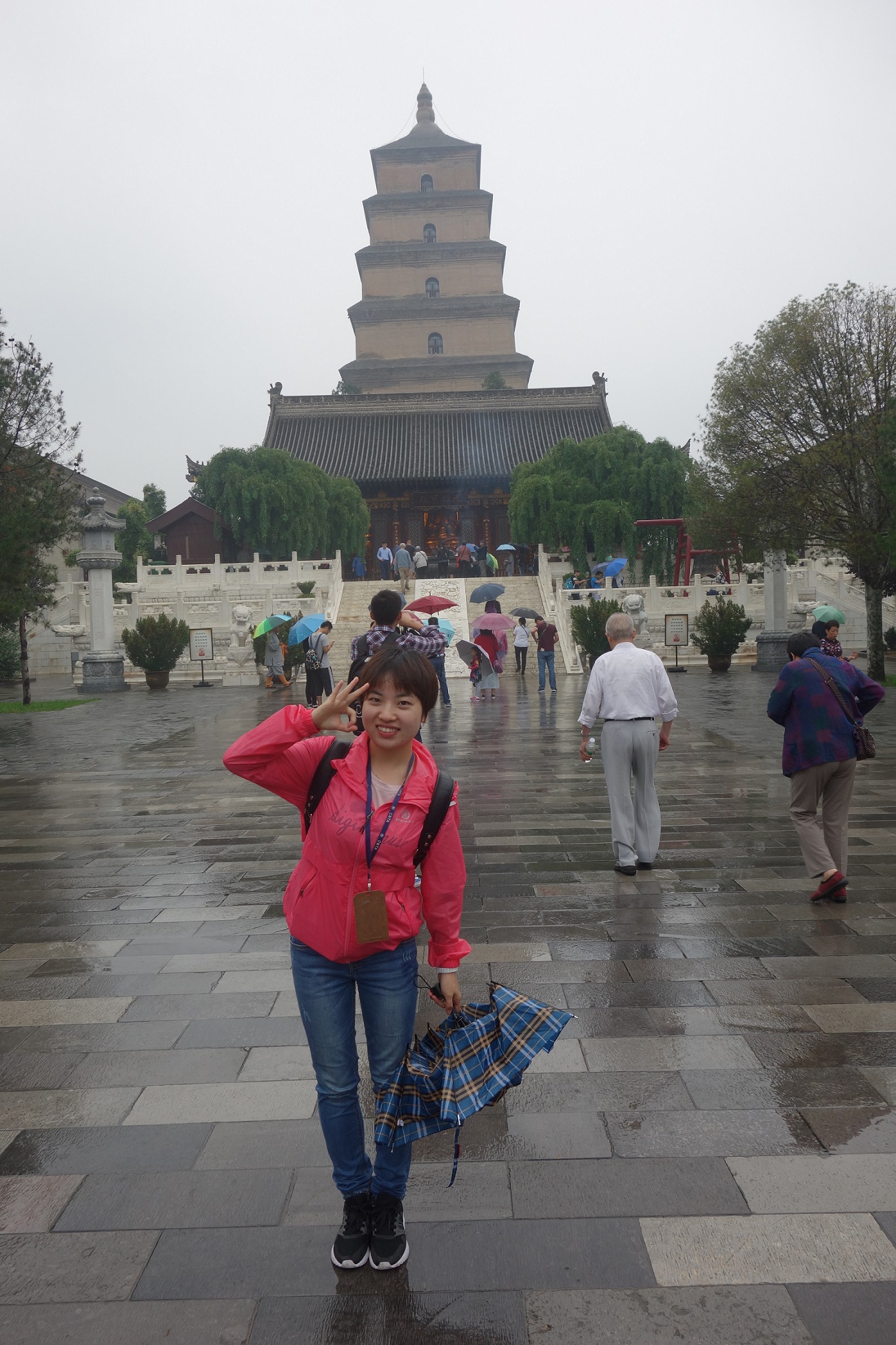 Awoke at 6 AM. This hotel room of ours is definitely the nicest in many ways of the hotels that we have stayed in. It is about 3 times the size of our very nice but tiny quarters in Hong Kong. Feeling great! Sunny will soon be meeting us and taking us for a walk on the old city wall. It is now raining in Xian. We have just returned from our walk on the old city wall. The wall is between 30 and 40 feet in thickness. It was built between 1370 and 1378 AD during the Tang dynasty. Our walk was a rainy walk. We arrived early so early on we were the one brave souls on the wall. A few years ago Jay and I slept on the Great Wall of China somewhere north of Beijing. Just Jay and I and our local guide. We won't be doing any wall sleeping today. The old wall of Xian encircles the entire city and will take about 3 hours to walk and maybe about half of that time if by bicycle. The names of some of the masons are written on the bricks. If the work of the mason was less than satisfactory the emperor could have that brick layer killed. All over China we have seen how clean everything is. No litter on the streets or sidewalks. Trash receptacles are everywhere and people use them. It's about pride and self-respect. Following the walk on the old city wall we are off to the Big Wild Goose Pagoda, another place that I visited years ago but was long forgotten by me. This pagoda is yet another very busy place even on this rainy day. A Buddhist guide gave us a tour of the area.