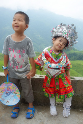 On the way to our destination we sampled some passion fruit. I found it to be very tasty. The elevation at our destination is about 4,000 feet. From late November through the month of February these roads are closed because of the snow. We just visited the village of Ping'an where about 170 minority families live with more than 700 people. All of these people have the same family name "Liao". There are two attractive sites in Ping'an Village called "Moon with seven stars" and "Nine dragons and five tigers" separately. It has been over a 2 hour drive to get here. We then climbed the mountain. At the time it seemed to be an endless but spectacular climb to the peak. Photo opportunities where everywhere. We later enjoyed lunch in a spectacular setting. This area is favorite for the Chinese in their own country.