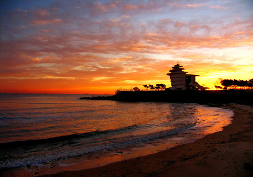 Beidaihe of QInhuangdao, starts from Dai River mouth in the west and ends in Yingjiao Rock, is a natural bathing beach. It is a large scale seaside summer resort with graceful scenery and complete equipment. The beautiful landscape lies in verdant mountains contrast with the vast sea, delicate villas blends in the greens, long and zigzag coast, placid beach, soft sands and limpid water.