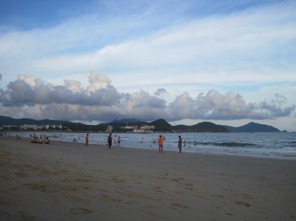 The first thing which was stunning to me was that everywhere around Chinese couples wearing matching Hawaiian Shirts and Shorts. I could not have imagined this picture before and I have to admit that it looks extremely funny. We walked along the beach, passing tens of see food restaurants facing the sea. It was the first time I saw Chinese women wearing Bikinis and moving freely like that at the beach. We simply sat down, enjoyed our ices and the atmosphere at the beach. Afterwards we went downtown to have dinner at a Muslim barbecue place at the street (Heping Jie). We had a specialty of Hainan: broiled dried squid, broiled eggplant and other food. As a dessert we got Qing Bu Liang, made out of coconut milk and a mixture of lots of different fruits, like pineapple, melon, red beans and so on. Then we had a walk across the night market and through a shopping mall before taking the bus into the direction of Dadonghai. We got off the bus at “Jiulu”, where lots of (mostly Russian) Clubs and Bars are located and went to “Rainbow Bar & Grill”, a western restaurant located at the harbor. There we had a Campari with Orange Juice, one of our favorite Cocktails in Germany but hard to get in China. It was a nice place, which was only tarnished by the live band and the mosquitoes. The next day we took the bus No 15 to Yalong Bay, the most beautiful beaches of the island, where we wanted to spend a day at the Ritz Carlton. After having entered the hotel we went to the beach and took a small cabana to relax and go swimming. The weather was beautiful and we had to take care not to get sunburned.