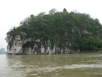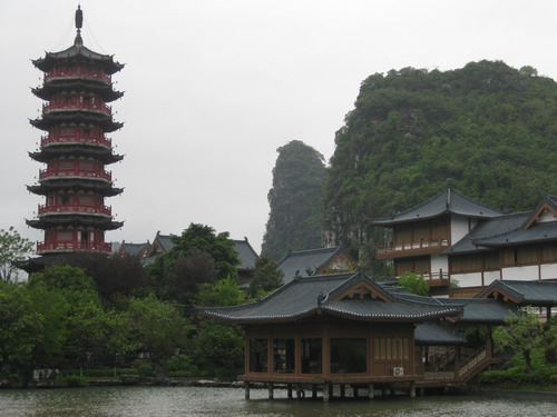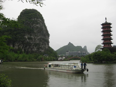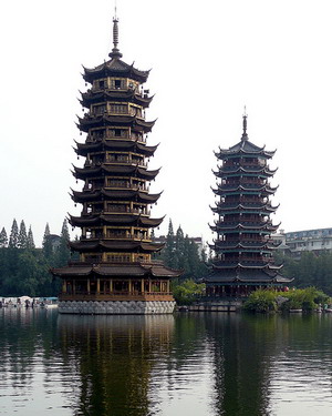 The new cruise route includes Li River and Four Lakes, we started the cruise from the pier at Elephant Trunk Hill, although it rained a little, it made the air more fresh and the scenery more clear and beautiful. People say the Guilin scenery is more attractive and charming in misty and rainy day, so, we were lucky to enjoy such fairy landscape. The boat turned around the Elephant Trunk Hill and let the travelers have chance to enjoy it with panorama. Then boat continued to sail along Li River, the cruise was leisure and tranquil, you can see the Seven Star Park far away and Fubo Hill closely. When the boat arrived Diecai Shan (Folding Brocade Hill), we disembarked there, you can have chance to climb up to the top of hill, but we just went through into the park. This park is just located in the Wooden Dragon Lake (Mulong Hu), from here, we were on the Four Lakes cruise. On the cruise, you can pass lots of different styles of bridges with its own story. No wonder, people say Guilin is like the Venice in China. After sailing in about 45minutes, we arrived the last stop in Chinese Fir Lake (Shan Hu). Here is the best shot point for the Sun Tower and the Moon Tower.