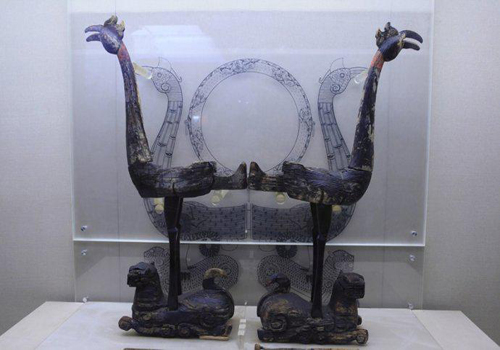 Huzuoniaojia Drum (with a tiger-shape seat and a phoenix-shape frame) – It is a very precious instrument in China’s warring states period. The tiger foundation seat is composed of two huge tigers who raise their heads and sit majestically. And on each tiger’s back stands a beautifully singing phoenix. The whole instrument is vivid and gorgeous. It is both music instrument and artistic work.