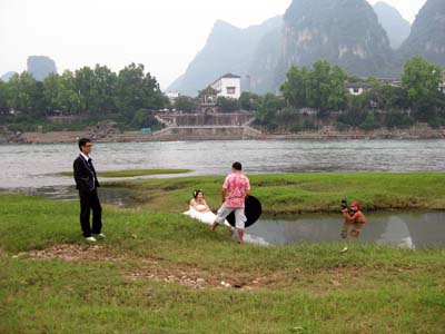 Arriving in Yangshuo, we walked along the West Street to the riverbank of Li River. There were lots of boats in the river. And we were told that the Li River rising in the Mao'er Mountain in Xing'an Country of Guilin. On the other side of the river, there was a small island, where some people are riding horses on the green grassland. The island was so beautiful that we decided to reach there by boat. Standing on the island, we had a relatively overall impression of Yangshuo: the West Street and grand mountains enhance each others' beauty, inverted reflection can be seeing in clear waters... A couple was taking their wedding photos. And we all admired the professional dedication of the photographer!