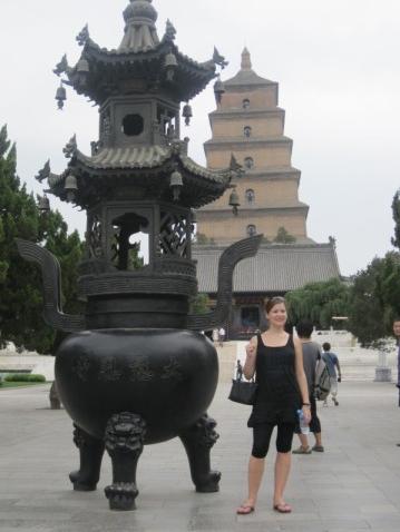 Finally we drove to Big Wild Goose Pagoda, a Buddhist Pagoda located in southern Xi'an. It was built in 652 during the Tang Dynasty and originally had five stories, although the structure was rebuilt in 704 during the reign of Empress Wu Zetian and its exterior brick facade renovated during the Ming Dynasty. One of the pagoda's many functions was to hold sutras and figurines of the Buddha that were brought to China from India by the Buddhist translator and traveler Xuanzang. Nowadays there are still 200 monks living in the temple, which is few compared to the 2000 they have been hundreds of years ago. The temple is very new; the only old and original building on the area is the Big Wild Goose Pagoda. It is possible to climb it up after paying an entrance fee, but we did not do that. However we surrounded it. Looking at it from “behind” you can see that it is not straight anymore which apparently is caused by underground water. I enjoyed the atmosphere there, with monks sitting around, trees and (apart from tourists walking around) silence.