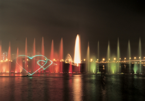 The fountain was constructed by a Portuguese - Spanish jointed company. It is equipped with 86 spouts and lit by 288 colored spotlights. The tallest water jet reaches 80 meters in height.