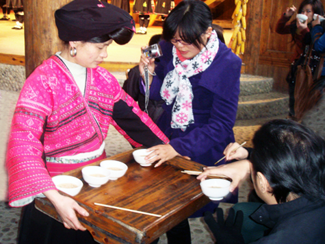 The whole performance lasted for about 50 minutes and the interactive performance with the audiences are the highlights. Some gentlemen would be invited to be the bridegroom to perform with the bride-actresses. And you can always hear laughs during their play. I was impressed by the hair custom of females of Hong Yao. They keep the custom to wear long hairs from twelve or thirteen years. They do not cut hair causally and always collect the cut hairs carefully. Becoming mother, the females can wear their cut hairs. In Huangluo Yao Village, there are more than 60 long-hair females. And you can tell whether a female of Yao people is married and have baby or not. During the performance, the audience could taste local Oil Tea, Glutinous Rice Cake and wine.