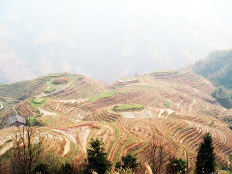 (Plus: terrace is a common scenery formed in the mountain areas of south China which is made up of fields and crops. While large-scale terraces like Longji Terraces is hardly seen. Longji Terraces is praised as the crown of world terraces, which covers about 66 square kilometers on the hills with altitudes ranging from 300 meters to 1100 meters. The sceneries of Longji Terraced Fields change with seasons because of the changing color of crops. It can be different block paintings in spring, summer, autumn and winter: green, golden or white and black. )