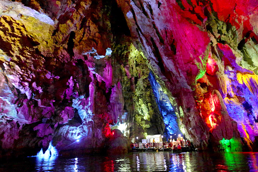 Dragon Palace is located between Heavenly Pool and Clamshell Rock. It is more than 5000 meters long and 850 meters can be visited. At its gate, stalactites of different sizes and shapes droop down to caress water. Their endpoints turn outwards. The formation is caused by the deposit of calcium carbonate as well as the function of lower plant algae. Because those algae depend on sunshine to grow, they grow outward year after year and give rise to such karstic formation. At the bottom of the cave, countless springs come out from rocks and merge into a river. Stalagmites and stalactites on the ceiling are lit by colored LEDs and cast wondrous and resplendent reflections on water. The whole cave looks just like a crystal palace.