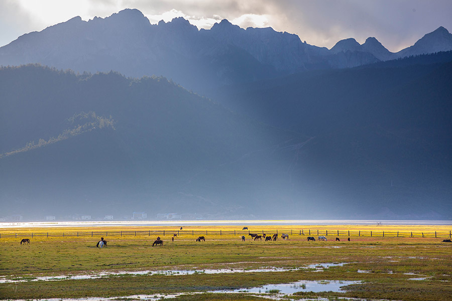 Finally, we will head to Napahai Lake, both an ideal grazing field for herdsmen and a paradise for many species of birds. This is, in the true sense, a seasonal lake. When summer comes, snow on the adjacent mountains melts and flows down into about ten rivers forming a vast lake. In the dry season, Napahai becomes boundless green grassland--the best time for herding sheep or cattle. Nevertheless when you will come, the whole scenery will be kind of unique.