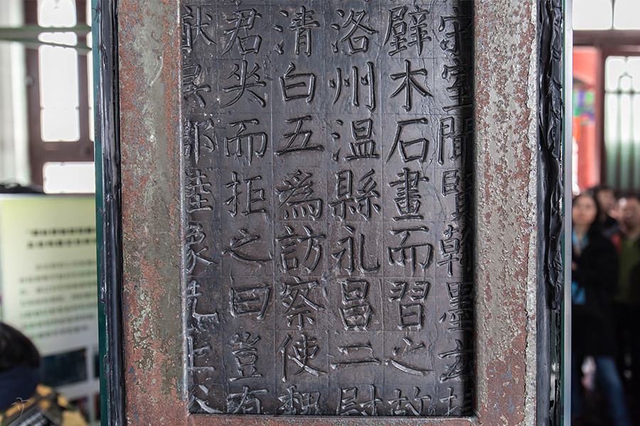 Stone inscription of Kaicheng Shijing (开成石经), including Zhouyi (周易), Shangshu (尚书), Shijing (诗经, The Book of Songs), Liji (礼记, The Book of Rites), Zuozhuan (左传, Zuo's Commentary), Lunyu (论语, The Analects of Confucius), Xiaojing (孝经, Book of Filial Piety), Erya (尔雅), Mengzi (孟子) and other four Chinese classics, is kept here. These were set books for scholars in feudal society in Chinese history. To keep preserve them permanently and to avoid mistakes when the classics were transcribed, they were carved on stone tablets as a model and placed at the Imperial College for proofreading. This is the unique unbroken stone inscription of ancient Chinese classics that have been found so far.